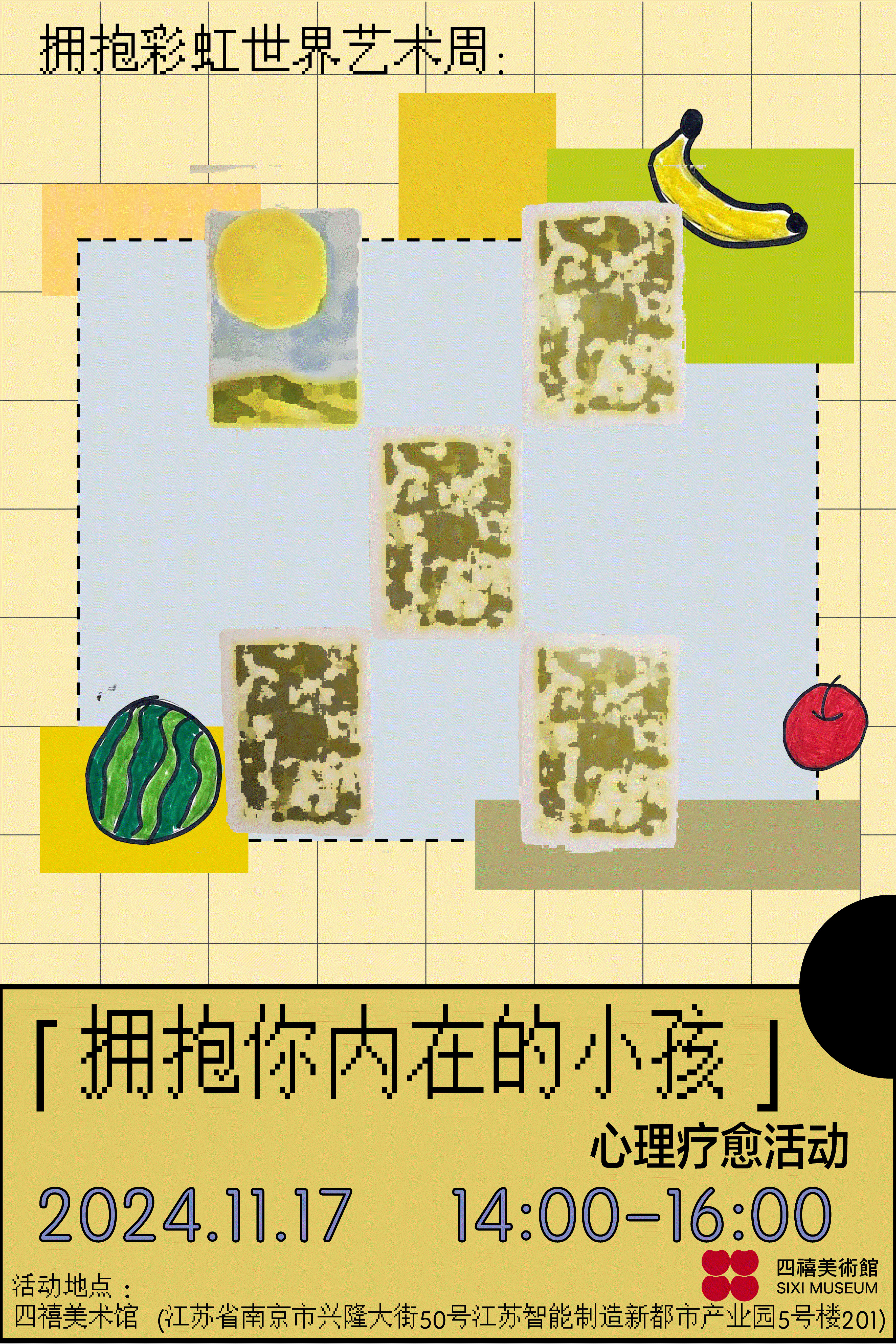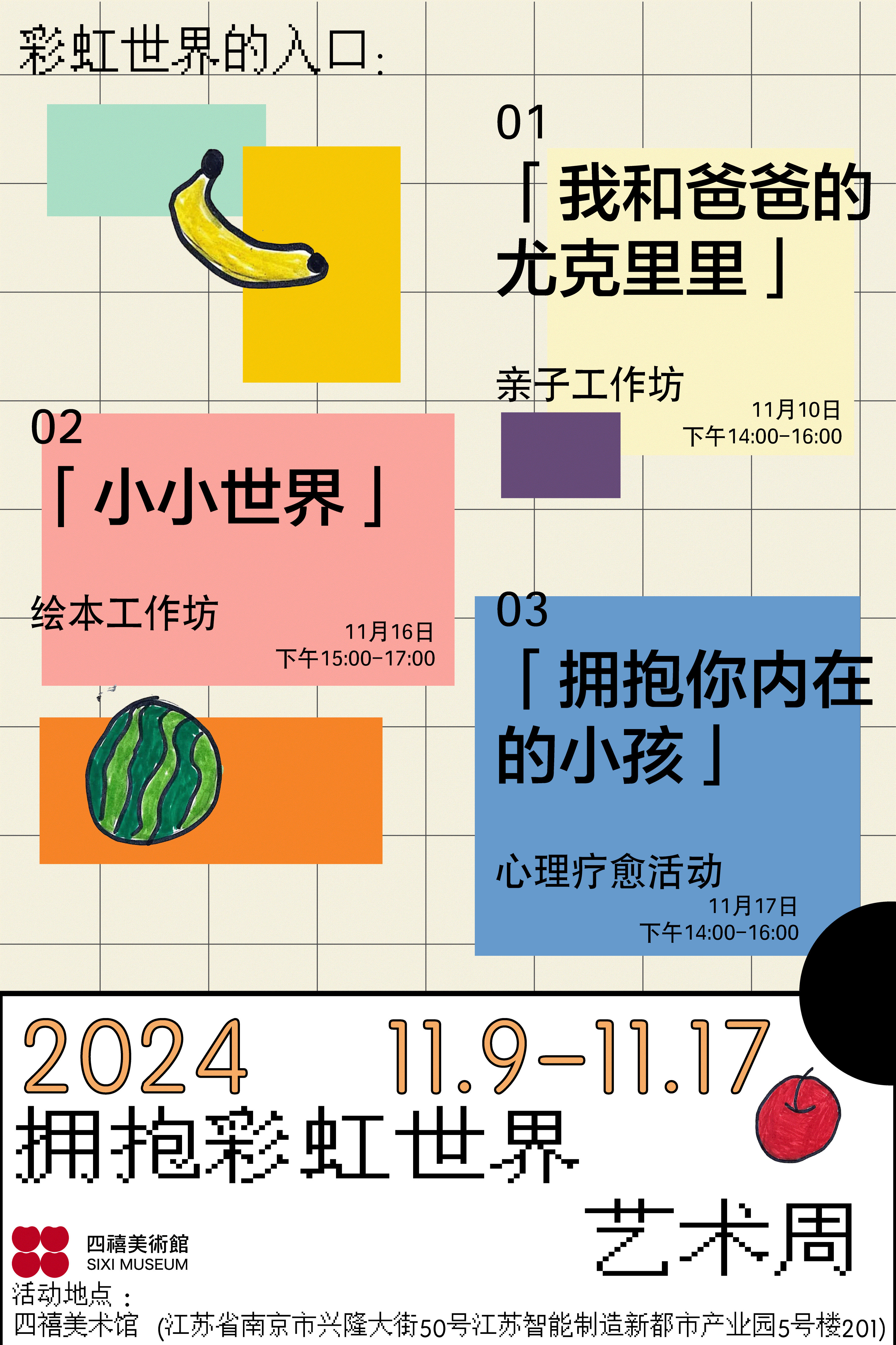 2024年11月9日-11月17日,在“彩虹世界的入口”艺术群展期间,四禧美术馆将同期举办“拥抱彩虹世界艺术周”活动,包含「我和爸爸的尤克里里」亲子工作坊、「小小世界」绘本工作坊、「拥抱你内在的小孩」心理疗愈活动。期望您能在活动中收获一份幸福的陪伴时光,拥抱自己内心中未曾被照顾过的小孩。